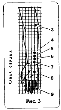 | Точки воздействия на ногах. Иследуя точки поднимаясь по ноге вверх, мы вначале найдем нужные нам на внутренней стороне - это точки знакомого нам канала почек (рис.10).  Точку 6 канала почек, столь необходимую нам при неврастенических нарушениях, стеснении в груди, коме в горле, слабости, отсутствии радости, "все не мило", мы обнаружим, если палец будет спускаться с внутренней лодыжки вниз. Тут и располагается точка, которую китайцы назвали "большой бокал". Точку 5 вы найдете за внутренней лодыжкой. Она расположена между верхушкой внутренней лодыжки и ахилловым сухожилием. Показанием к ее использованию является повышенная раздражительность, когда все, что раньше воспринималось нормально, теперь злит, когда вы срываетесь на крик при каждом поводе и без повода. Кстати, если это случается часто, не мешает проконсультироваться по поводу вашей щитовидной железы. Неврастения, предменструальный синдром с вегетативными нарушениями - тоже показания к использованию точки 5. Точка 3 - "море света", располагается между внутренней лодыжкой и аххиловым сухожилием. Она всегда придет вам на помощь, если вы страдаете от бессонницы, перехватывает дыхание и возникает стеснение в груди, появляется немотивированная раздражительность, вместо спокойной беседы со своими близкими вы срываетесь на крик. Следующая очень важная точка б, имеющая широкий спектр действия, расположена на так называемом канале селезенки - поджелудочной железы (см.рис.10). Этот канал помимо весьма важных функций, связанных с пищеварением, состоянием мышц, нарушениями в полости рта, связан с эмоциями - он обуславливает задумчивость, склонность к глубоким размышлениям. Точка, о которой идет речь, точка 6 этого канала - называется "перекрестком трех инь". Она располагается на расстоянии, равном четырем вашим пальцам от наружного края внутренней лодыжки. Используется при очень многих заболеваниях: при неврозах, вегетативных нарушениях ,связанных с климаксом, при бессоннице, рефлекторных болях в сердце. Болезненность в этой точке - сигнал о том, что у вас проблемы с половыми органами. Еще несколько точек расположенны на передней поверхности ноги (рис. 11) .  Они относятся к каналу желудка, значение которого ясно, так как без нормального пищеварения, обеспечивающего весь организм питательными веществами, не может быть здоровья. Этот канал тесно связан с предыдущим, а его точки располагаются на всем протяжении тела, начиная от лица и кончая наружным краем корня ногтя второго пальца стопы.Вашему вниманию мы предлагаем еще две точки. Точка 36 канала желудка наиболее важная, о ней ходят легенды, на Востоке ее называют "точкой долголетия" - она заведует энергией нижней половины тела, постоянное ее раздражение вызывает улучшение обменных процессов, стимуляцию иммунитета, улучшение пищеварения и т. д. В нервно-эмоциональном плане эта точка незаменима, недаром ей дали название "божественное равнодушие или хладнокровие". Вы легко отыщете эту точку, если положите свою ладонь на колено, ваш средний палец будет располагаться на искомой точке. Во всех случаях неуверенности в себе, стресса, волнений на работе, повышенной раздражительности, нервозности, плохого сна, тяжести в ногах, спазмах в желудке на нервной почве - массируйте точку "божественное равнодушие". Даже в тех случаях, когда вы вдруг ощутили, 